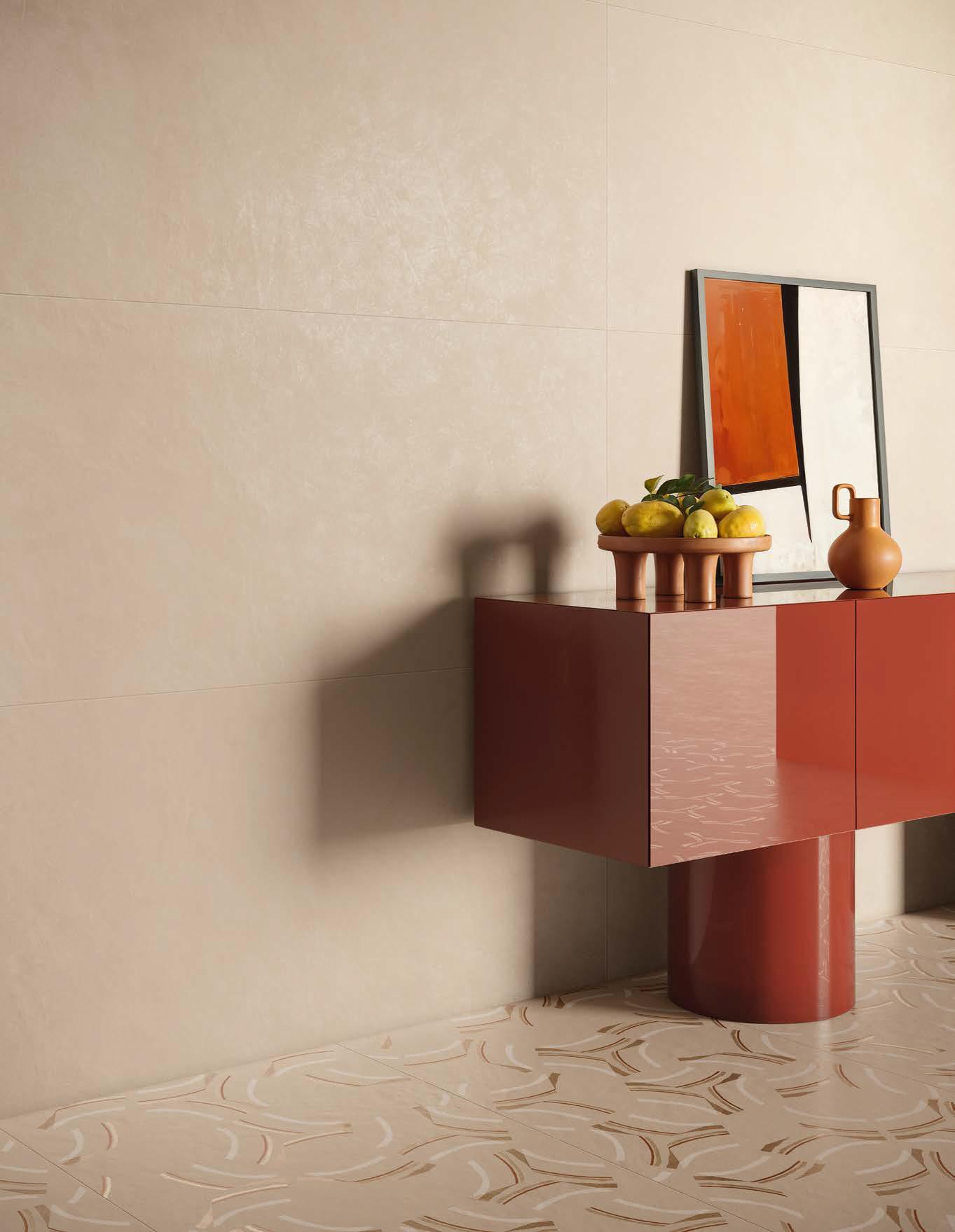 Delyca to kolekcja Monocibec, która celebruje czysty kolor i miękką, płynną formę, idealnie wpisując się w czysty, współczesny styl. Powierzchnie imitujące żywicę nadają wnętrzom wrażenie wizualnej ciągłości dzięki dużym rozmiarom. Lekkie, geometryczne dekoracje dostępne są w dwóch eleganckich paletach: chłodnej gamie szarości, bieli i pudrowego błękitu oraz ciepłej w odcieniach